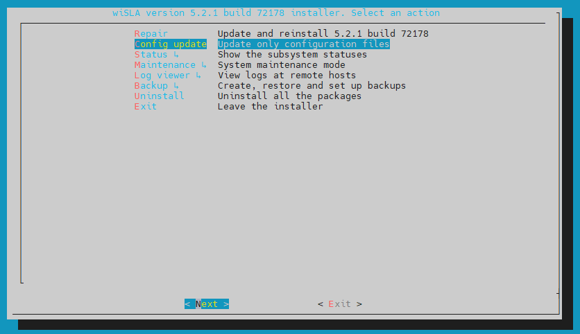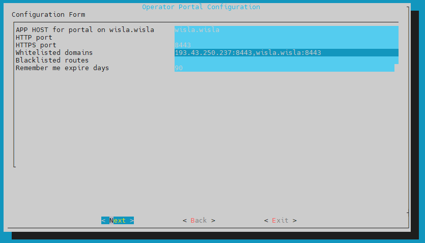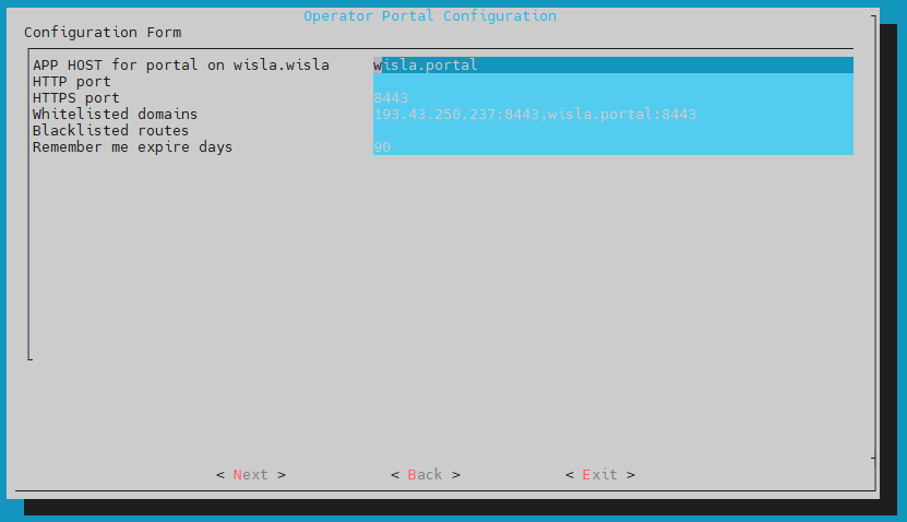 Тут видно что проблемы вызвана настройка portal.properties. Для устранения проблемы и настройки параметров APP HOST потребуется подключиться по SSH к серверу wiSLA под пользователем wilsa. Запустить программу установки системы перейти в меню "config update"