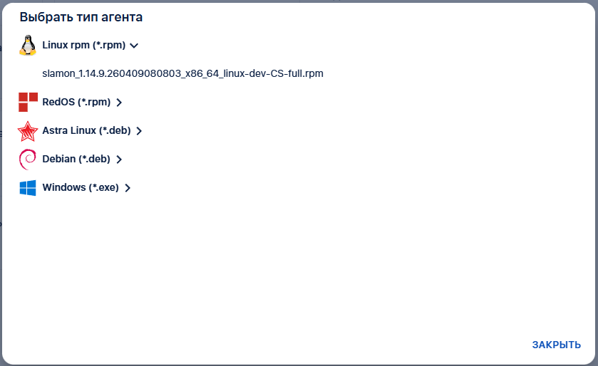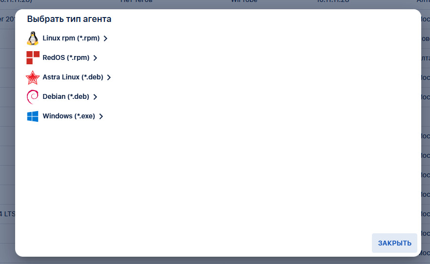 После нажатия кнопки "Скачать зонд" пользователю будет предложено выбрать тип агента для своей операционной системы.