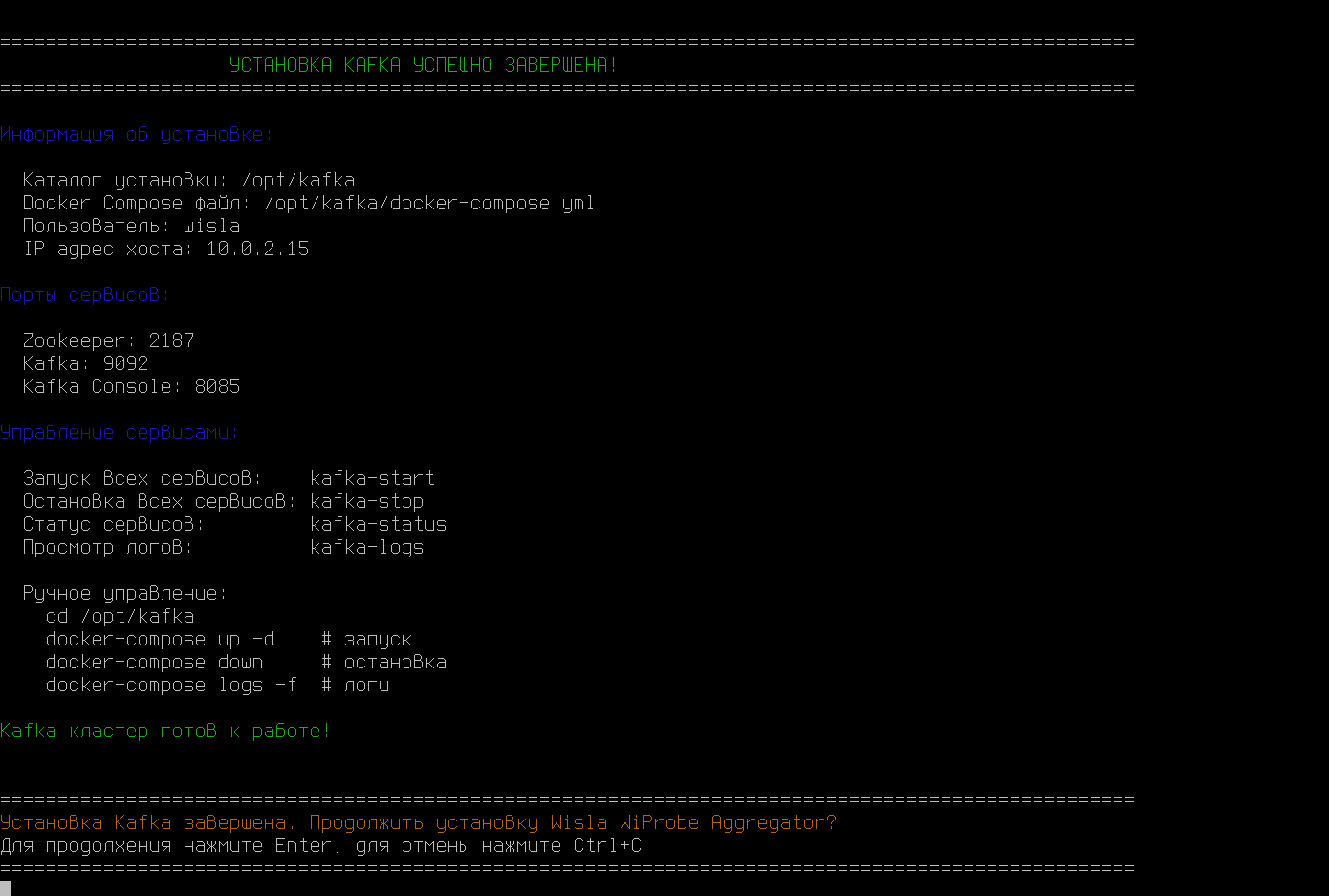 - По окончанию установки выведет на экран команды для проверки работы и предложит перейти к установке Wiprobe Agregator. Нажмите ENTER.