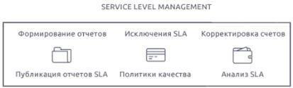 Центром платформы wiSLA является подсистема управления SLA (Service Level Management), которая обеспечивает выполнение набора ключевых функций в рамках процесса управления качеством услуг: формирование периодических отчётов SLA, расчет компенсаций за нарушение уровня обслуживания и учет времени согласованных перерывов работы (отключение электропитания в офисе клиента, планово- профилактические работы, форс-мажоры и т.д.).