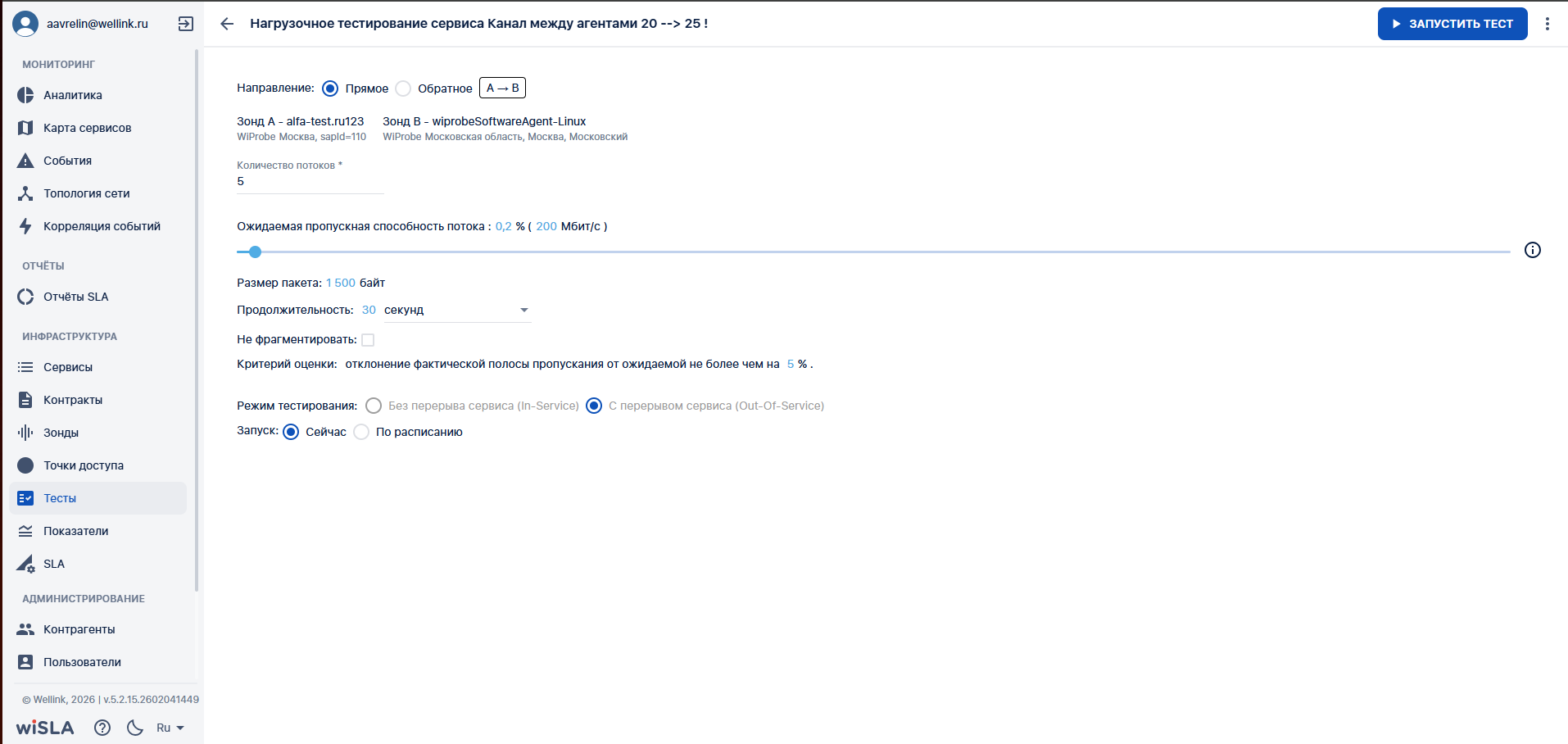 Кнопка нагрузочного теста в сервисе отображается только для измерений с тестами "U-тест", "TWAMP", "L2" и "P-тест" (вне зависимости от типа сервиса). |