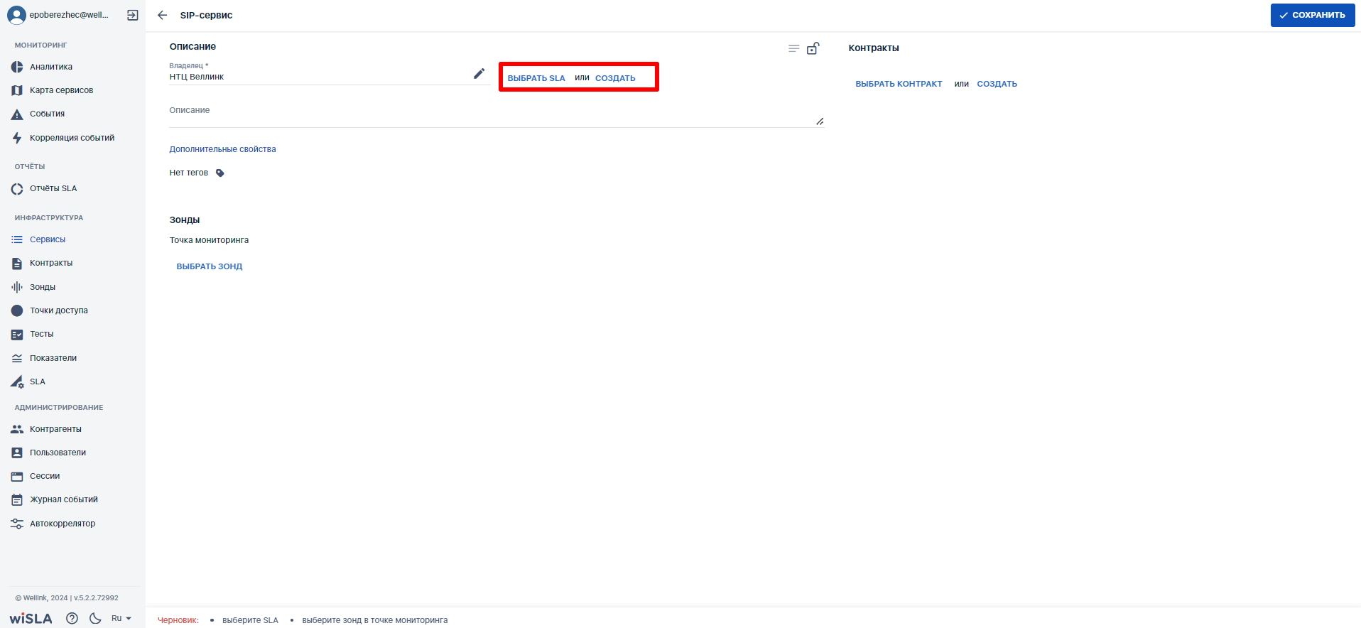 Выбрать опцию создания сервиса "Канал связи"/ "Доступность услуги" | |||