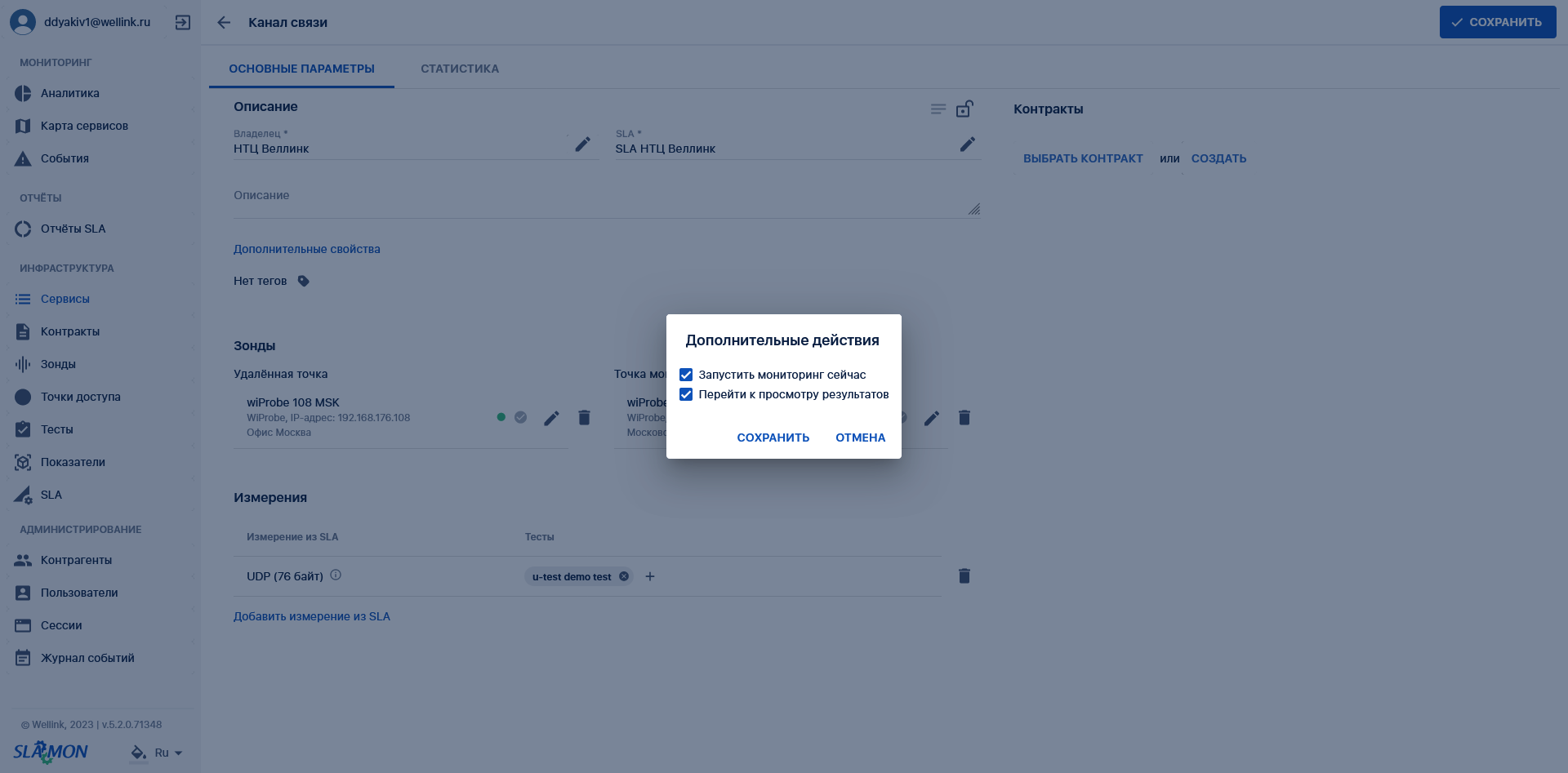 | Установлен чекбокс "Запустить мониторинг сейчас" и не устаровлен "Перейти к просмотру результатов" при создании из контракта? | Сохранить сервис в статусе "Активен" и открыть страницу настроек контракта | |