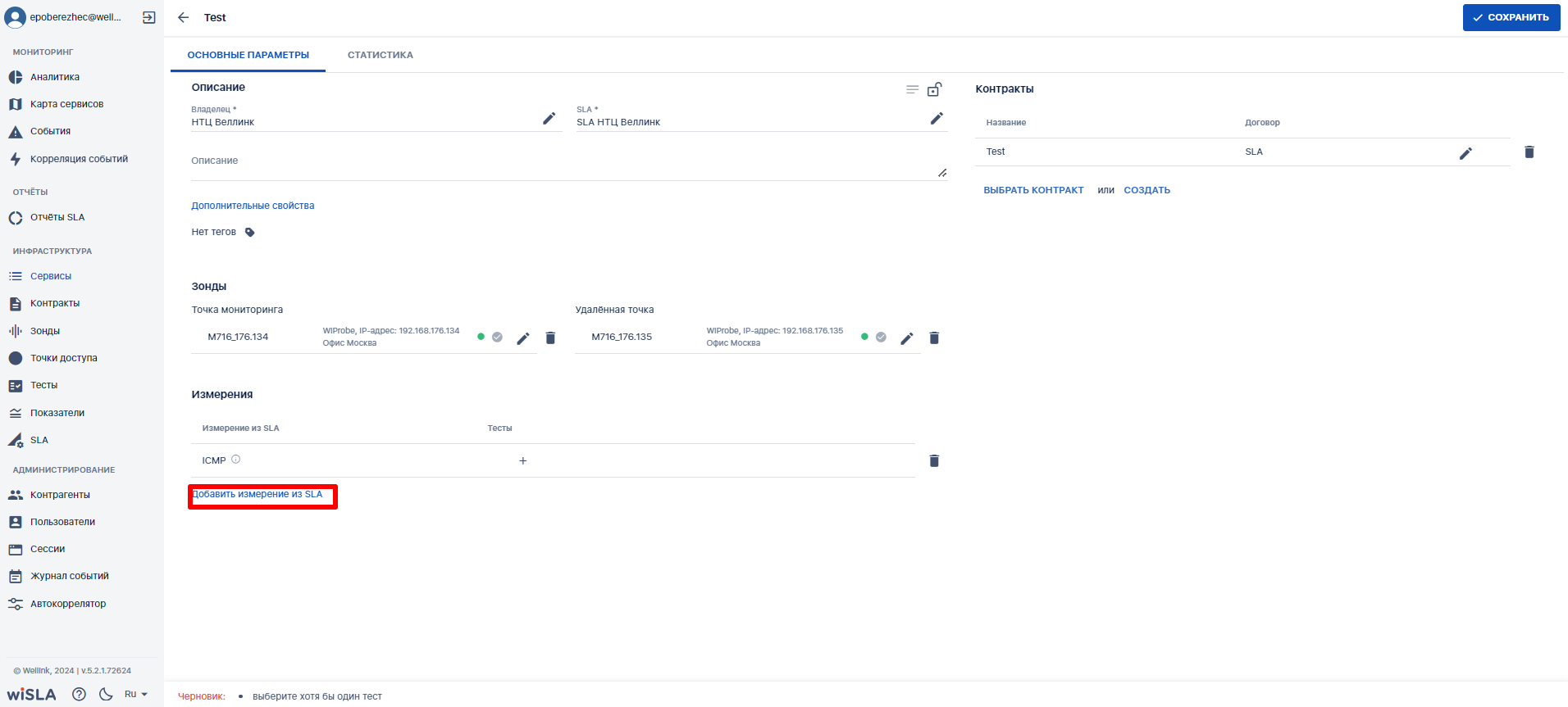 Ожидаемый результат выполнения данного сценария: по созданному сервису запущен мониторинг в соответствии с заданными параметрами (создан именно сервис, а не черновик сервиса). Отображается статус сервиса (спустя минимум 5 минут с момента запуска мониторинга), а также данные на странице просмотра показателей качества.