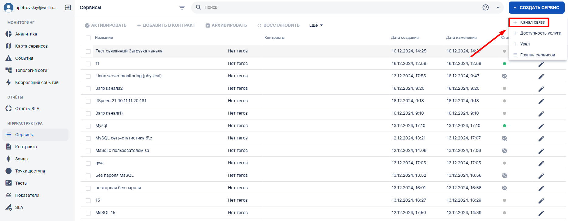 Открывает страницу создания сервиса типа "Канал связи". |