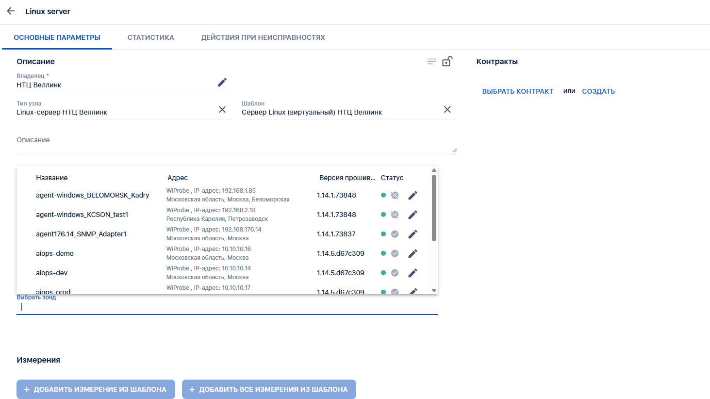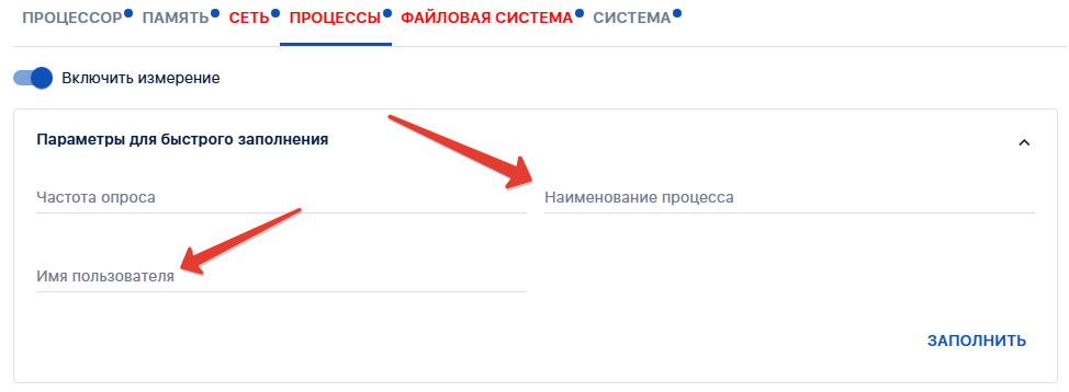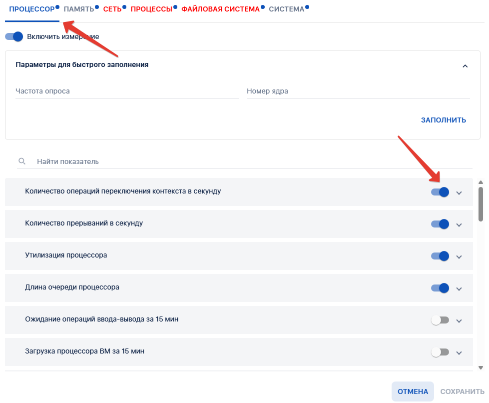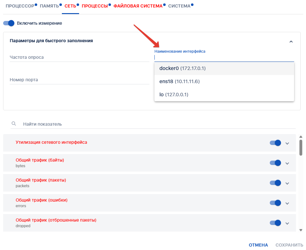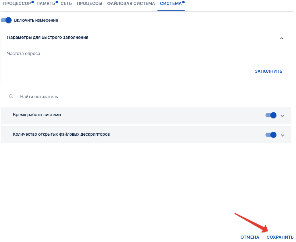 Есть метрики, которые не требуют дополнительных настроек при постановке на мониторинг, к примеру: метрики по профилям "Процессор" и "Память". Однако есть метрики профилей таких как "Сеть", "Процессы", где потребуется выбрать из выпадающего списка сетевой интерфейс для сбора статистики или заполнить наименование процесса или пользователя. - После настройки показателей жмем кнопку сохранить в модальном окне настроек показателей и жмем сохранить на странице создания/редактирования сервиса