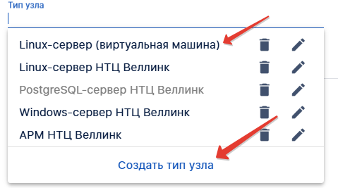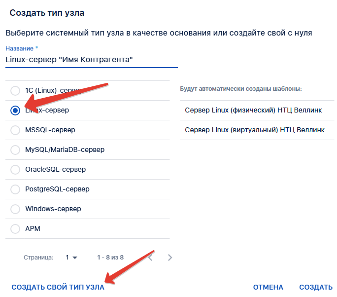 - Выбрав пункт "Создать тип узла" вам будет открыто модальное окно создания собственного типа узла. Можно создать на основе системных шаблонов: Linux-сервер, Windows-сервер, PostgreSQL и т.д. В таком случае будут автоматически созданы шаблоны под ваш контрагент.