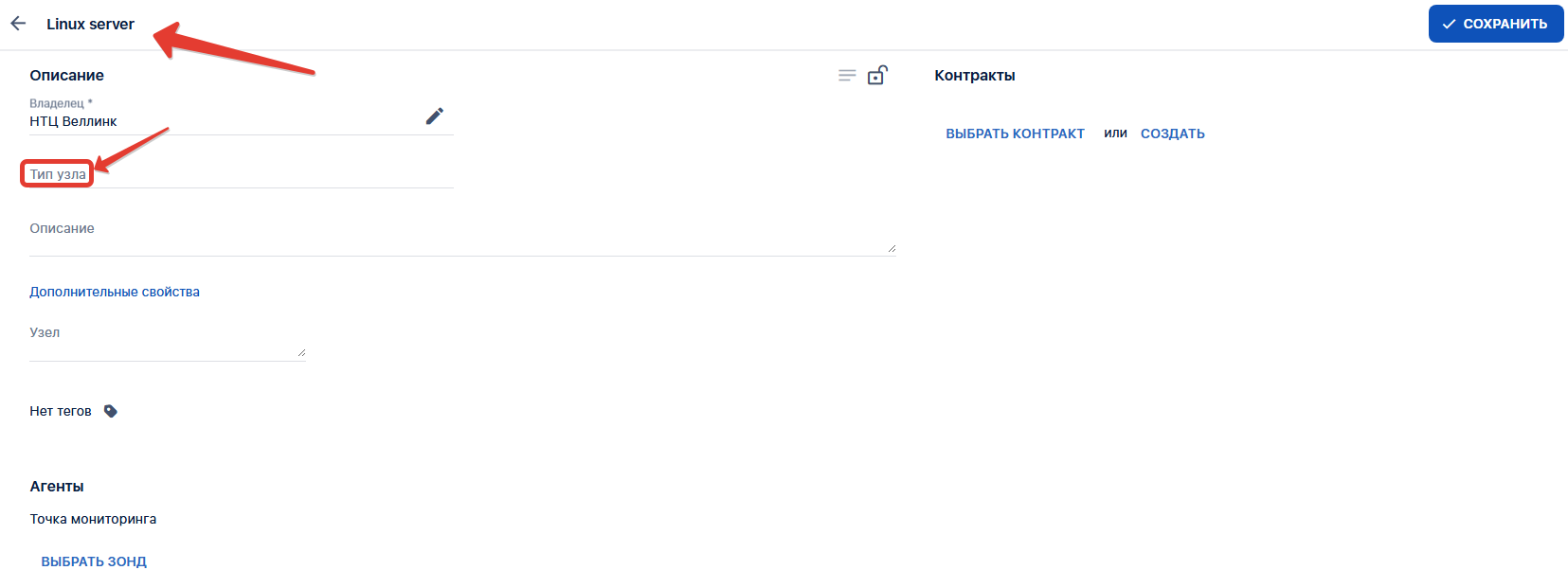 - Выбрать Тип узла, из готовых, либо создать свой.