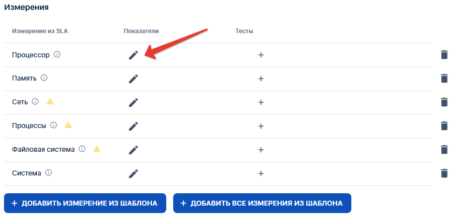 Что добавить показатель к существующему измерению, требуется добавить его к шаблону и прописать пороговые значения в соответствующем столбце. Добавить отдельный профиль SLA, для отображения на отдельной вкладке, можно через кнопку "+"