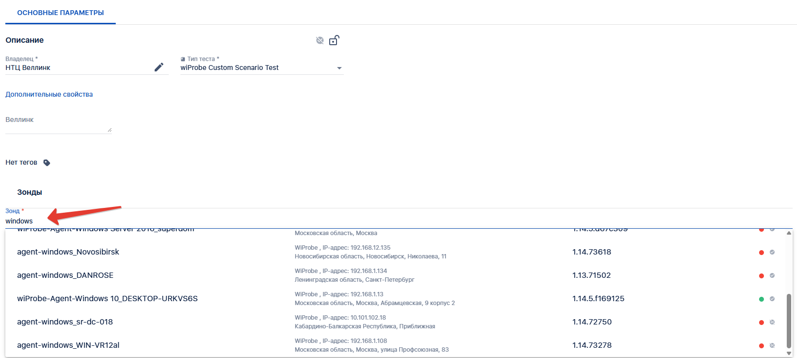 - В выпадающем списке выбираем тип "wiProbe Custom Scenario Test".