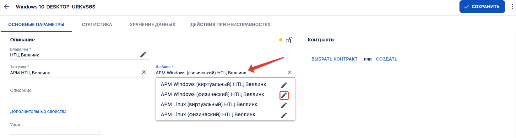 - Редактировать шаблон (выбираем из списка, действующий шаблон SLA)