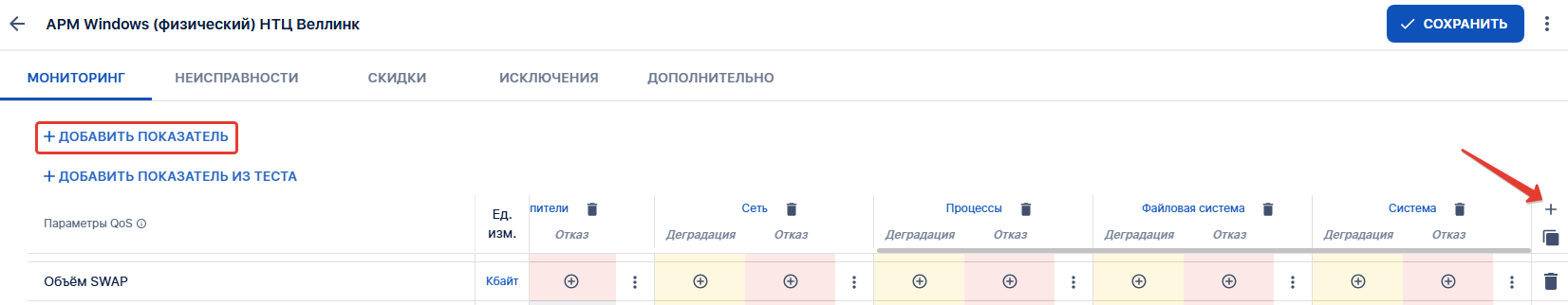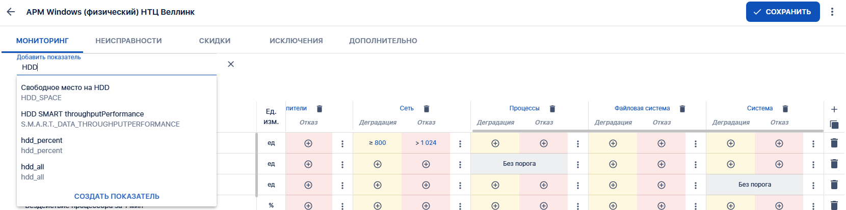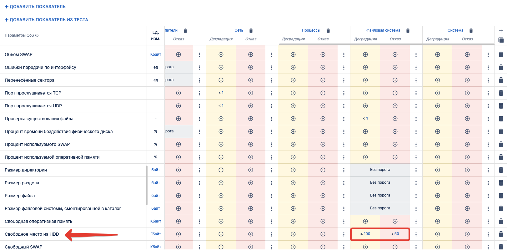 - Добавляем показатель к существующему измерению, либо создаём новое. Так же не забудьте указать пороговые значения отказа и деградации.