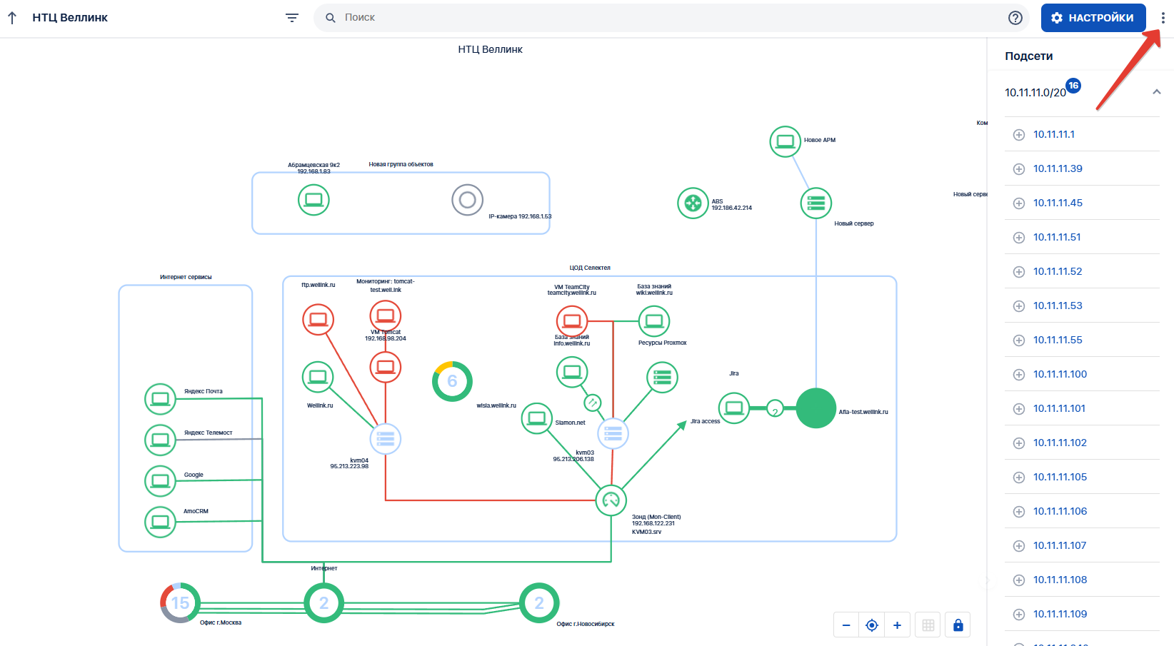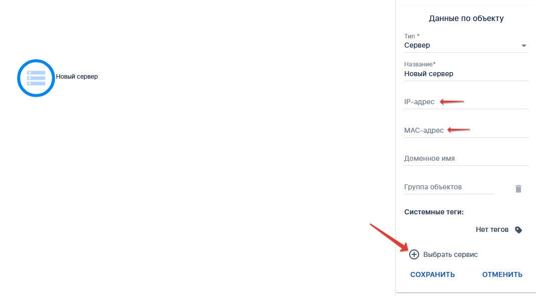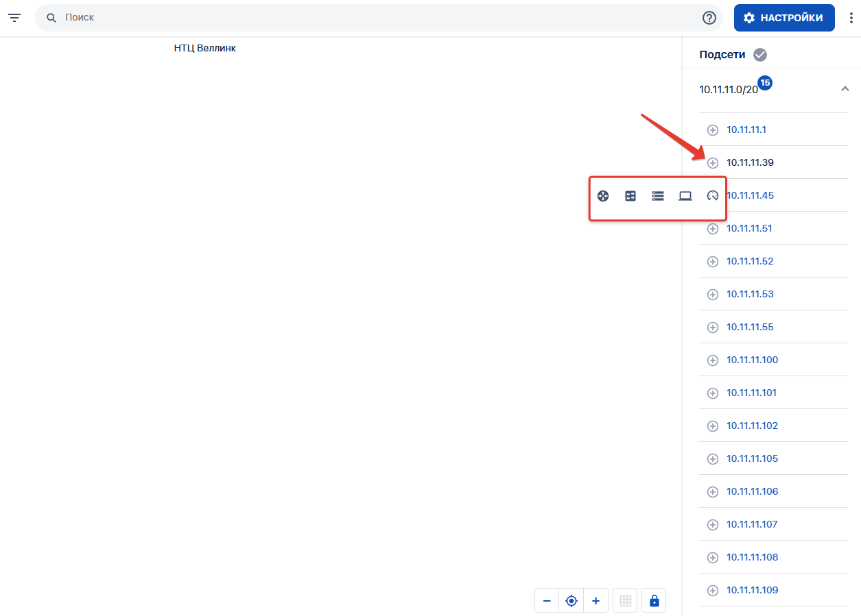 Результат сканирования выводится в выпадающем списке для каждой назначенной подсети. Чтобы добавить обнаруженный элемент на топологию, нажмите значок «⊕». Затем выберите тип элемента — после этого объект будет размещён на топологии, и к нему можно будет прикрепить соответствующий сервис.