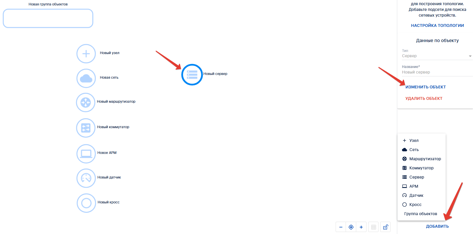 - ДОБАВИТЬ → выбрать элемент из списка → щелкнуть по элементу → в меню "Данные по объекту" → ИЗМЕНИТЬ ОБЪЕКТ