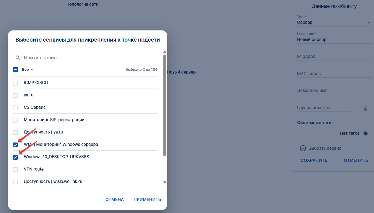 - В модальном окне выбираем через марке чек-бокс сервис. Можно несколько, тогда индикация элемента будет по наихудшему состоянию.