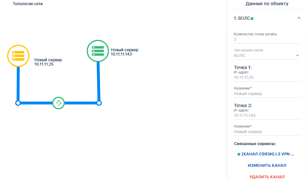 В итоге отображение канала связи на топологии выглядит следующим образом: цветовая индикация канала соответствует наихудшему статусу среди прикреплённых к нему сервисов. Тип линии соответствует выбранному типу канала. Для удобства пользователя предусмотрена возможность задавать количество точек изгиба линии. Линия канала содержит контекстные ссылки на сервисы — нажав на иконку статуса сервиса, можно перейти на страницу его текущих показателей.