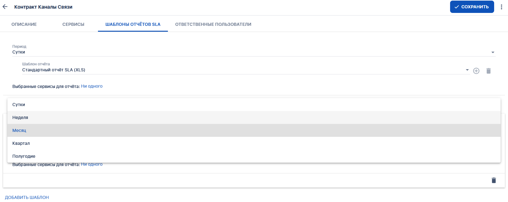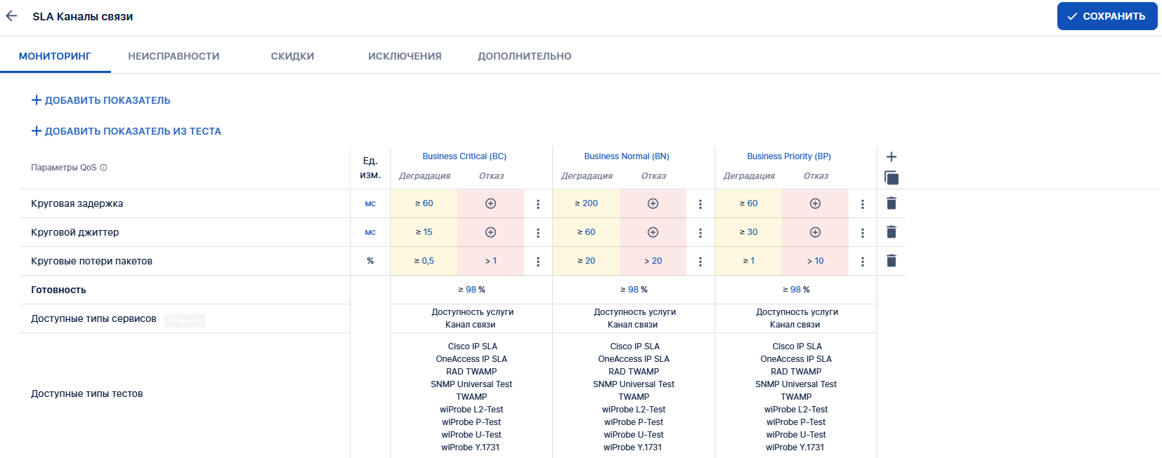 - Для каналов связи выбрать шаблон "SLA премиум" →