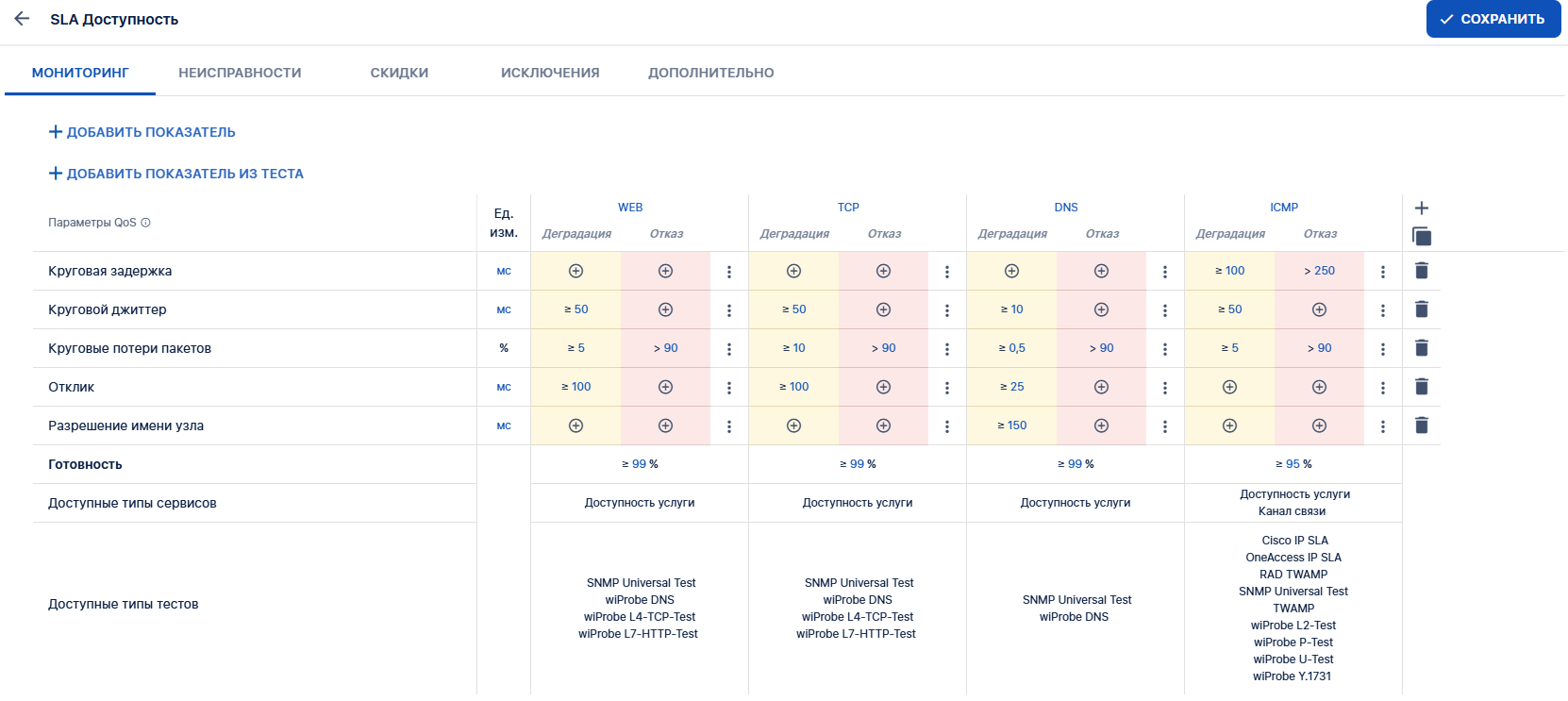К каждому сервису мониторинга прикрепляются SLA (Соглашения об уровне сервиса). В SLA четко прописываются пороговые значения для ключевых метрик. Для создания SLA необходимо перейти: Общее меню → SLA → ![]()