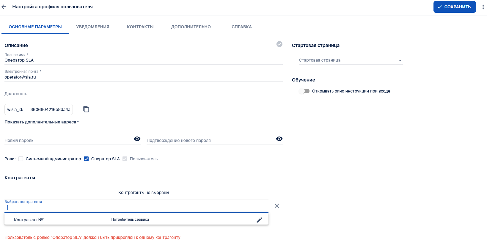 - Завести пользователя с ролью "оператор SLA". Общее меню → Пользователи →